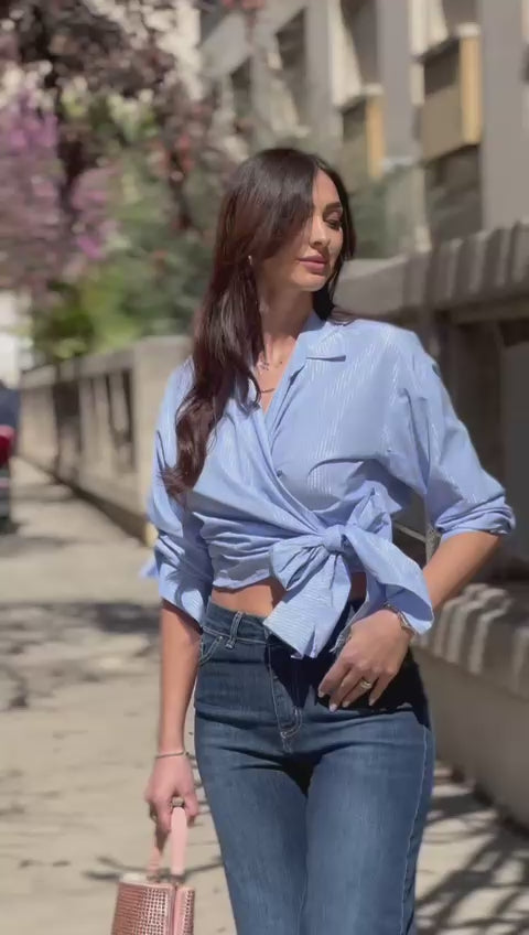 Questa camicia 311156 è realizzata con un tessuto speciale che contiene fili lurex impercettibili, fornendo un tocco di brillantezza discreta. Ampia fusciacca aggiunge un tocco di eleganza e può essere annodata a piacimento. Confortevole e sofisticata, perfetta per un look casual o formale.