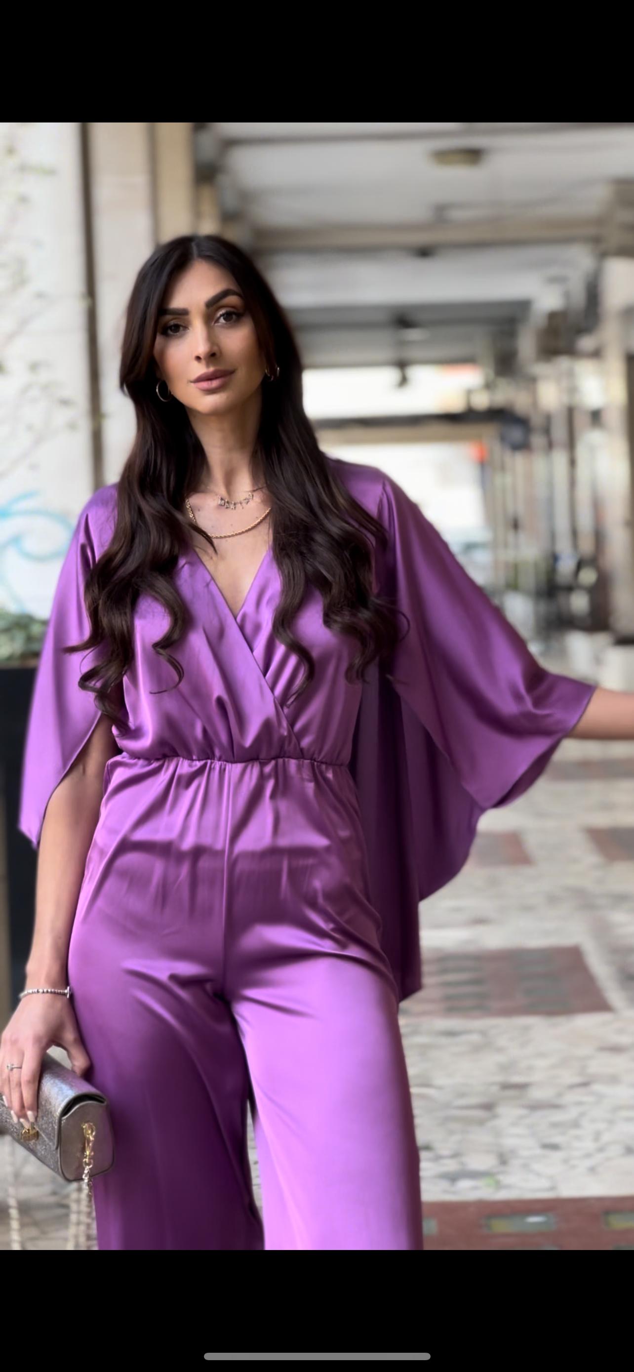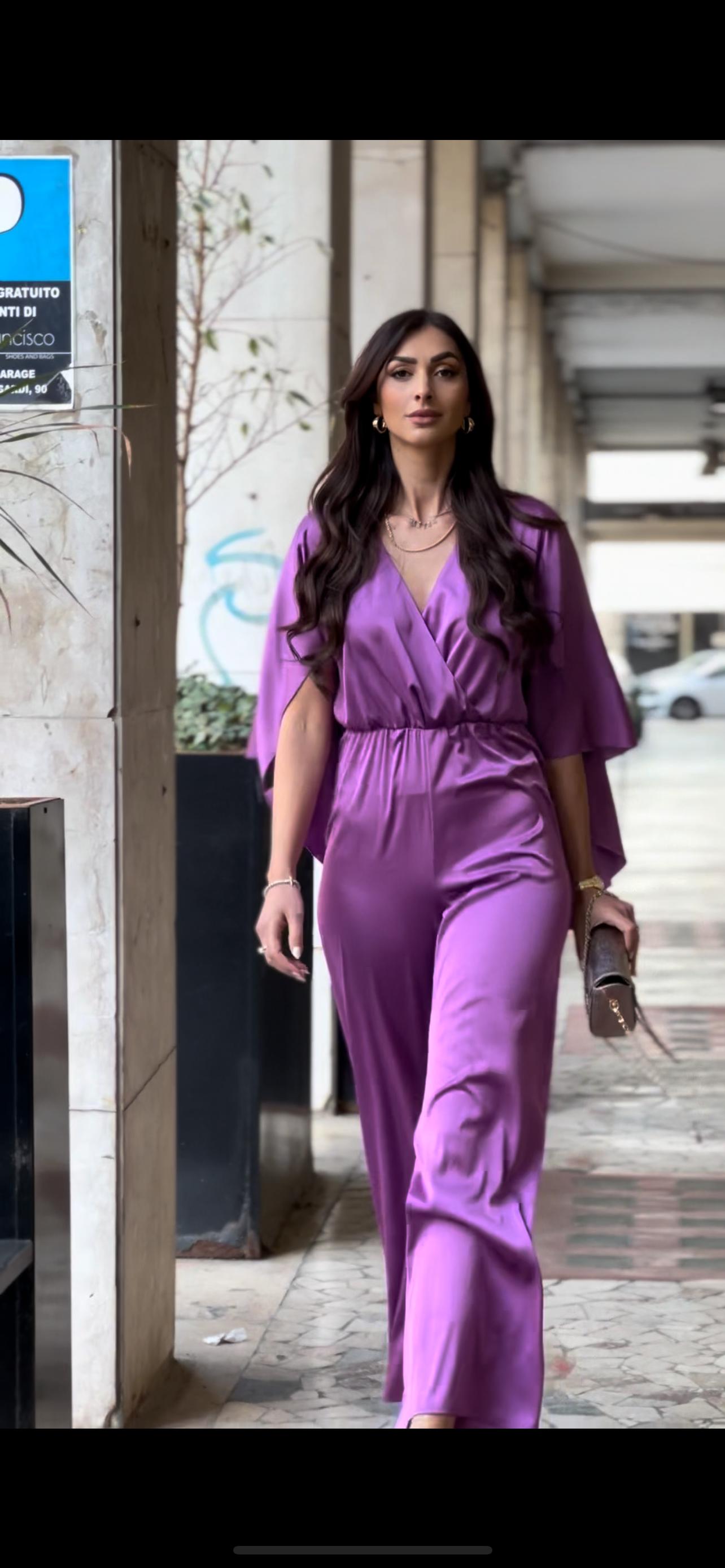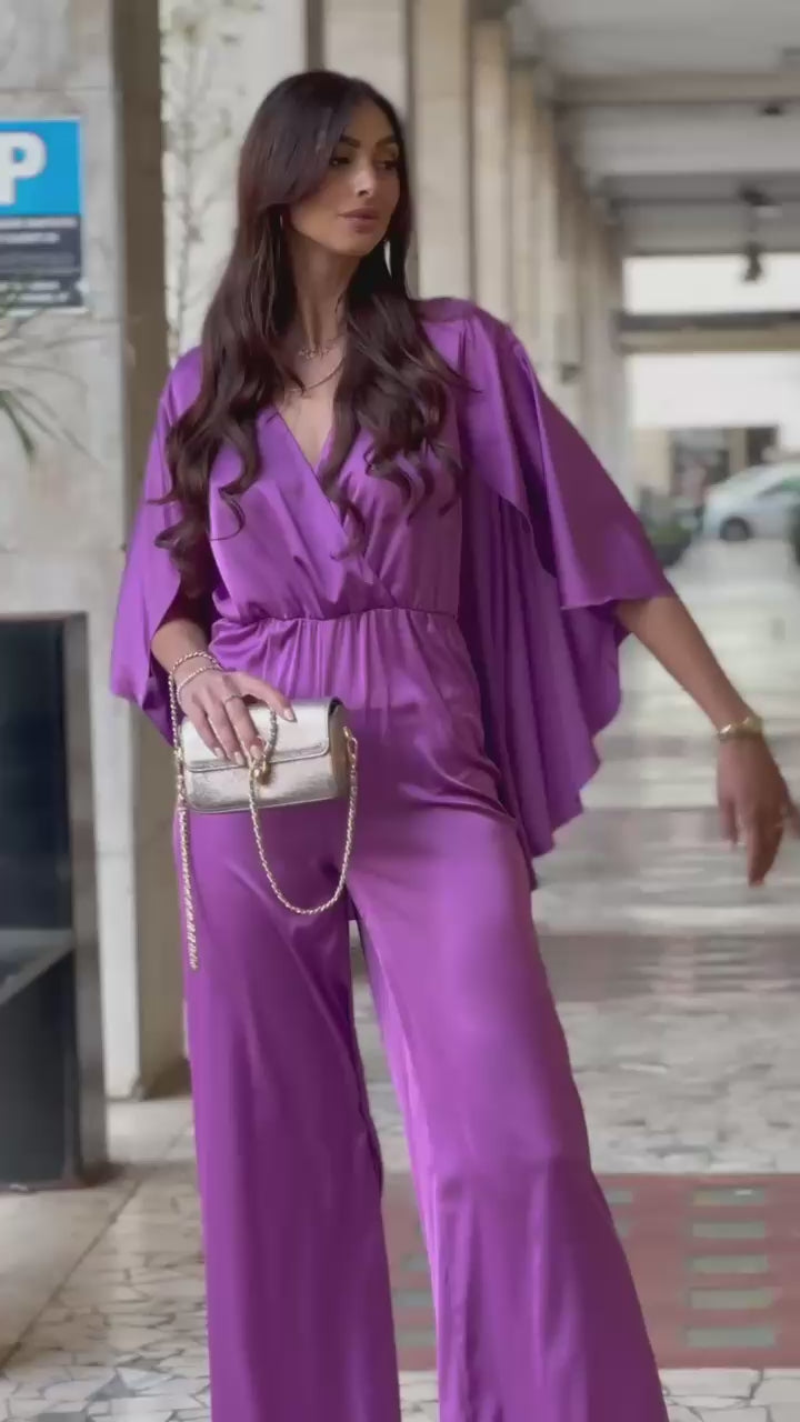 Questa tuta in viscosa presenta una mantella incorporata, perfetta per le giornate in cui desideri un look elegante e sofisticato senza rinunciare alla comodità. La mantella offre un tocco di femminilità alla tua figura, mentre la morbida viscosa garantisce comfort e leggerezza.